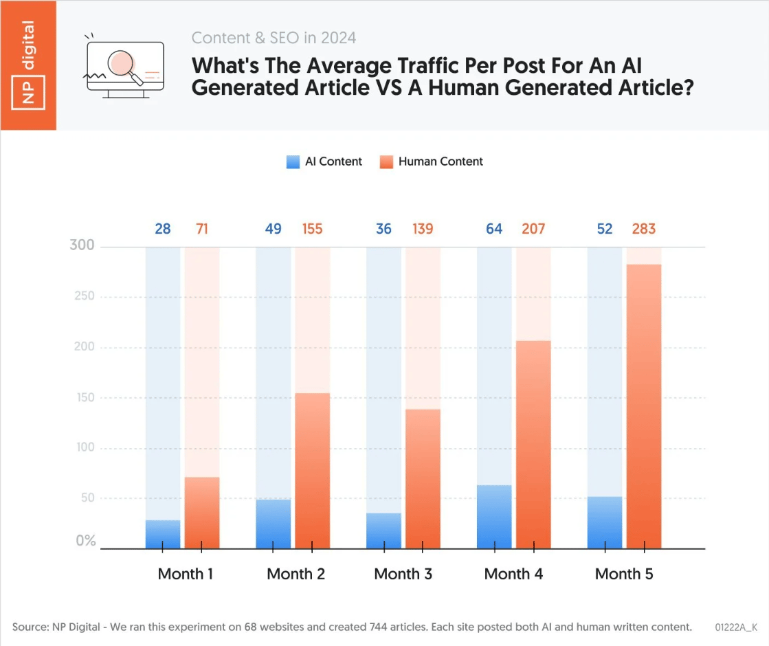 94.12% of the time human written content outranked AI-created content. By month 5 an AI article was generating 52 visitors a month while a human-written article was generating 283.